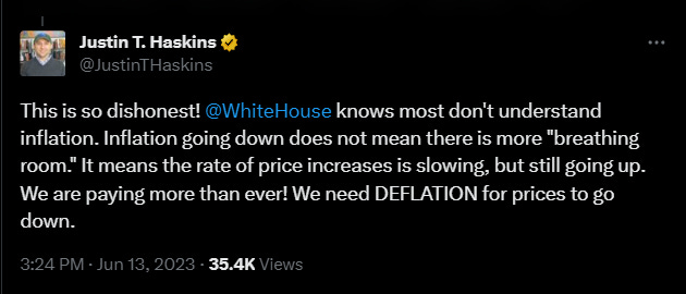 Nowhere in his statement did he point to any statistics or facts that prove his assertion that Biden’s policies are affecting “economic progress”. Nowhere in his statement did he point to any specific legislation or measures taken by congressional Democrats that benefit anyone in the middle class.