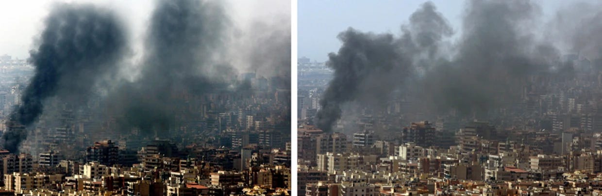 “The photograph showed two very heavy plumes of black smoke billowing from buildings in Beirut after an Air Force attack on the Lebanese capital. Reuters has since withdrawn the photograph from its website, along with a message admitting that the image was distorted, and an apology to editors.”